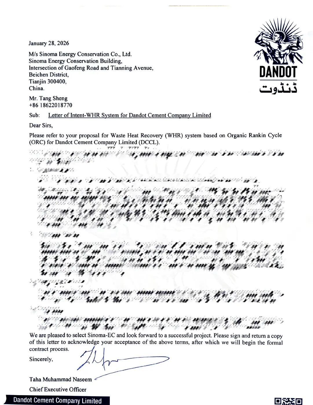 On January 29th, 2026, Sinoma Energy Conservation Ltd. officially received the Letter of Award for the Engineering, Procurement, and Construction (EPC) contract of the waste heat power generation project from Dandot Cement Company Limited in Pakistan.
